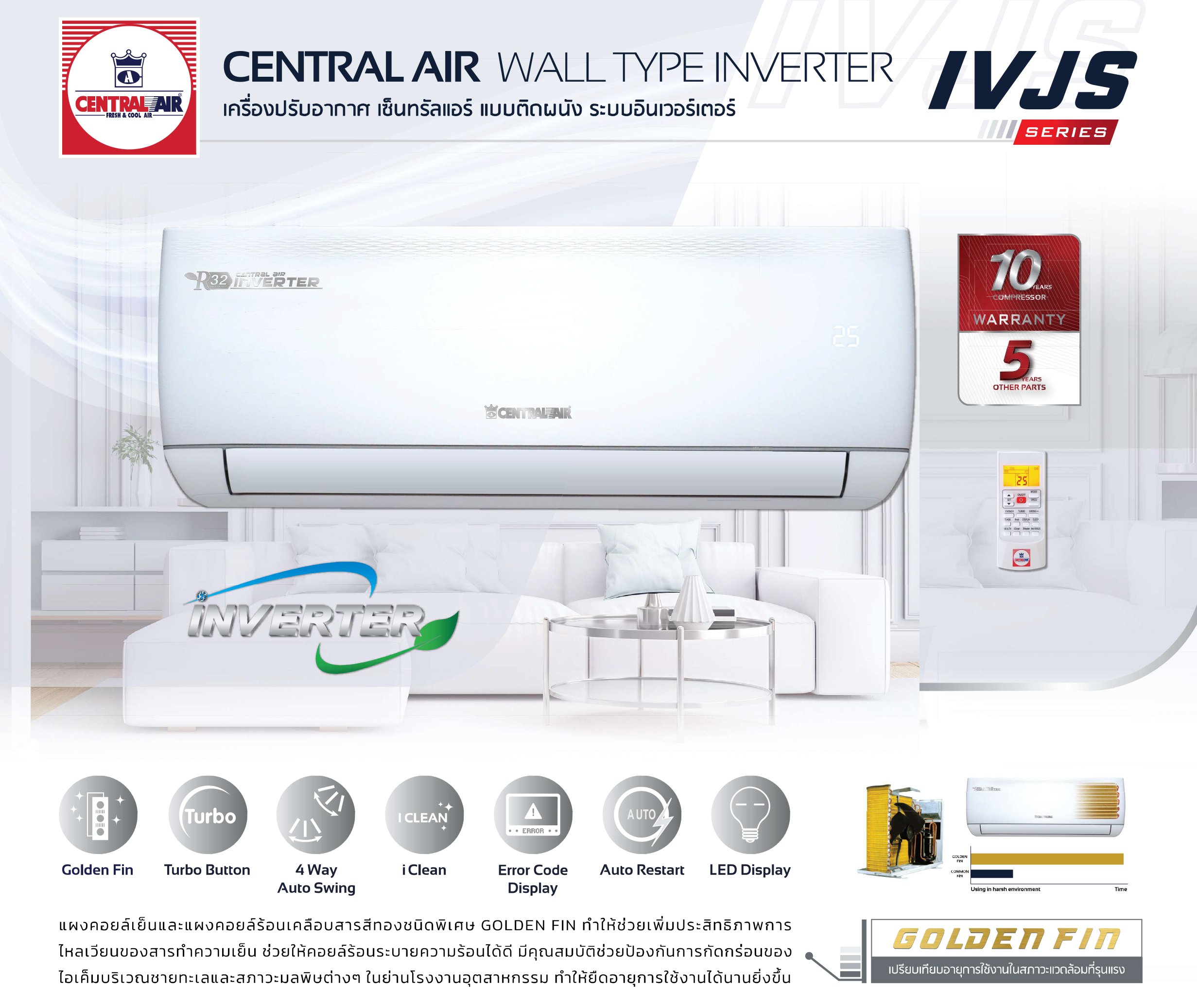 แอร์ Central Air รุ่น IVJS Series ใหม่ล่าสุด 2025!! ระบบ Inverter *ระบบ Auto Swing กระจายลมแบบ 4 ทิศทาง,Sleep Mode, Golden Fin, Auto Restart **แถมฟรี รางครอบท่อพรีเมี่ยม มูลค่า 1,200 บาท