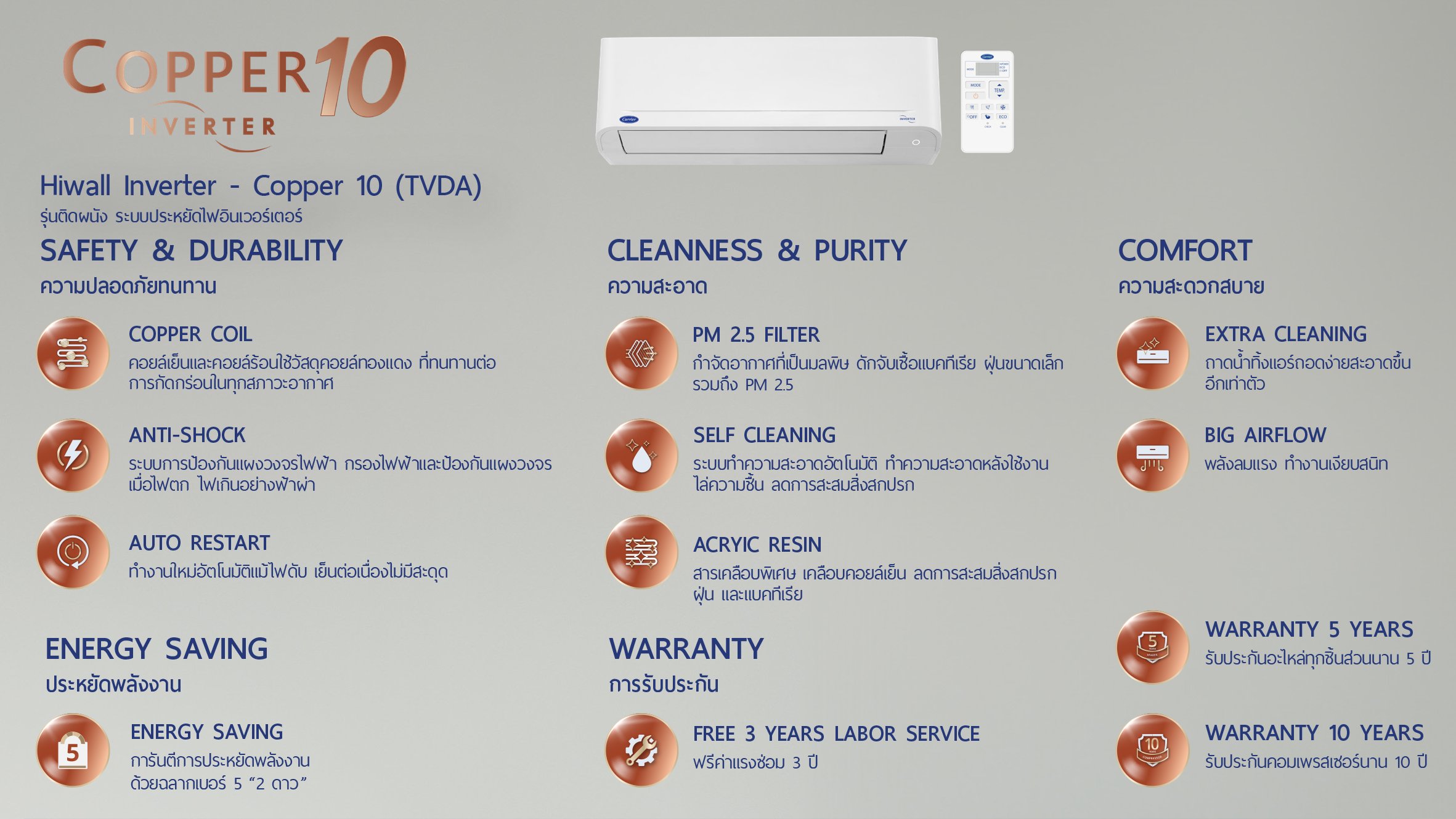 แอร์ Carrier รุ่น COPPER 10 Inverter 2025!! (ไม่มี Wifi) ประหยัดไฟกว่า 30% คอยล์เย็นและร้อนใช้ทองแดง ทนทาง มีกรองฝุ่น PM2.5**แถมฟรี รางครอบท่อพรีเมี่ยม มูลค่า 1,200 บาท