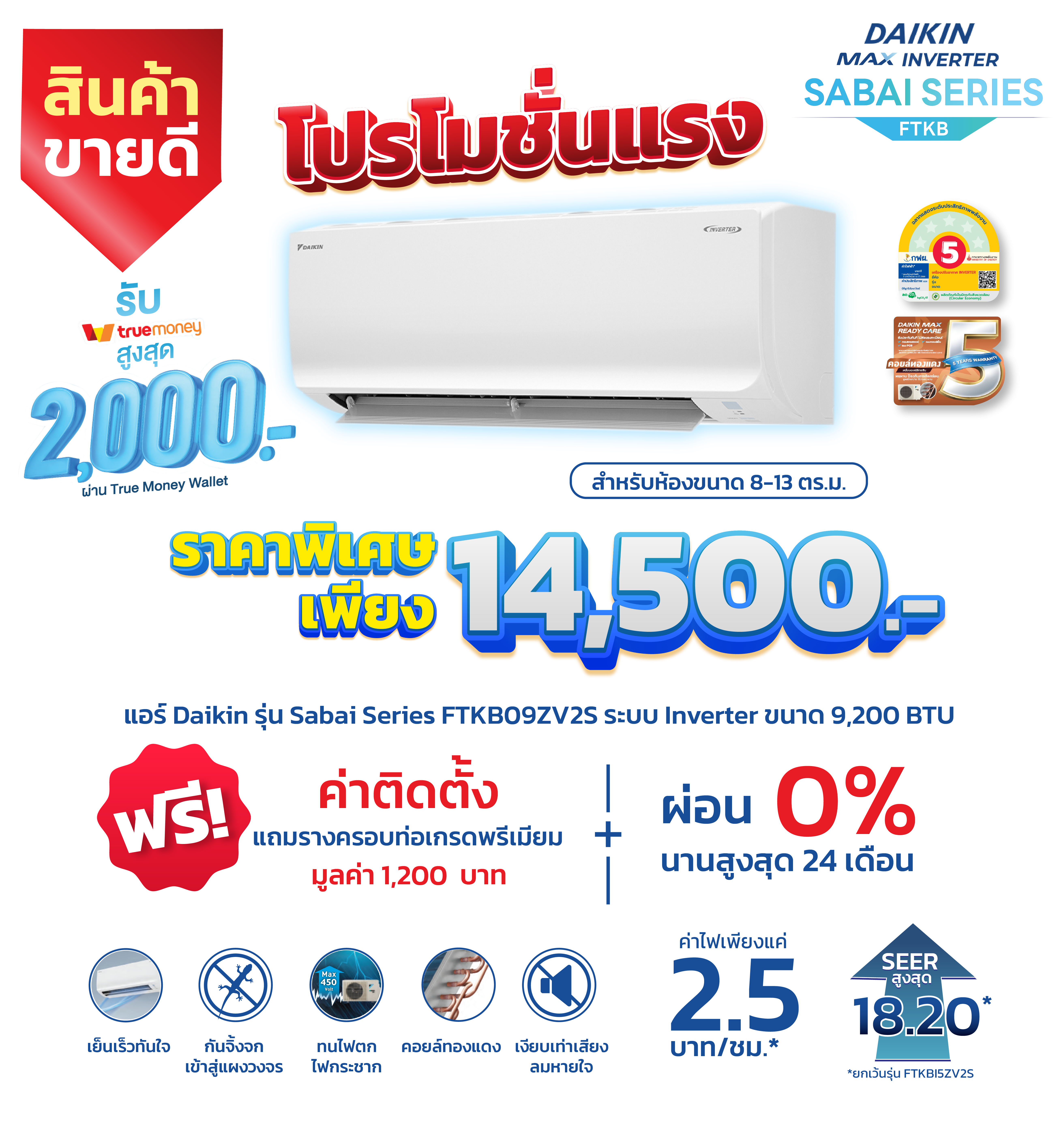 แอร์ Daikin รุ่น MAX Inverter SABAI SERIES FTKB-Z New 2025!! รุ่นขายดีที่สุด *สบายงบ สบายใจ ราคาเบาๆ ด้วยค่าไฟเฉลี่ยเพียง 2.5 บาทต่อชม เสียงเงียบ และป้องกันจิ้งจก แมลงขนาดเล็ก และป้องกันไฟกระชาก **แถมฟรี รางครอบท่อพรีเมี่ยม มูลค่า 1,200 บาท